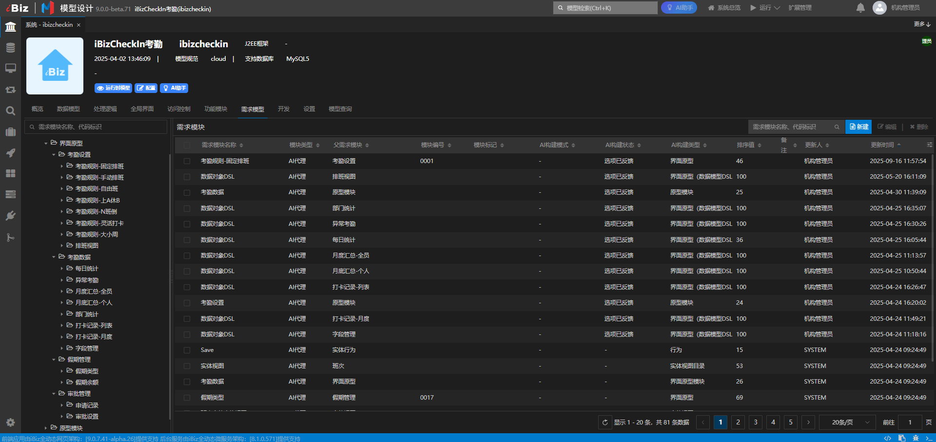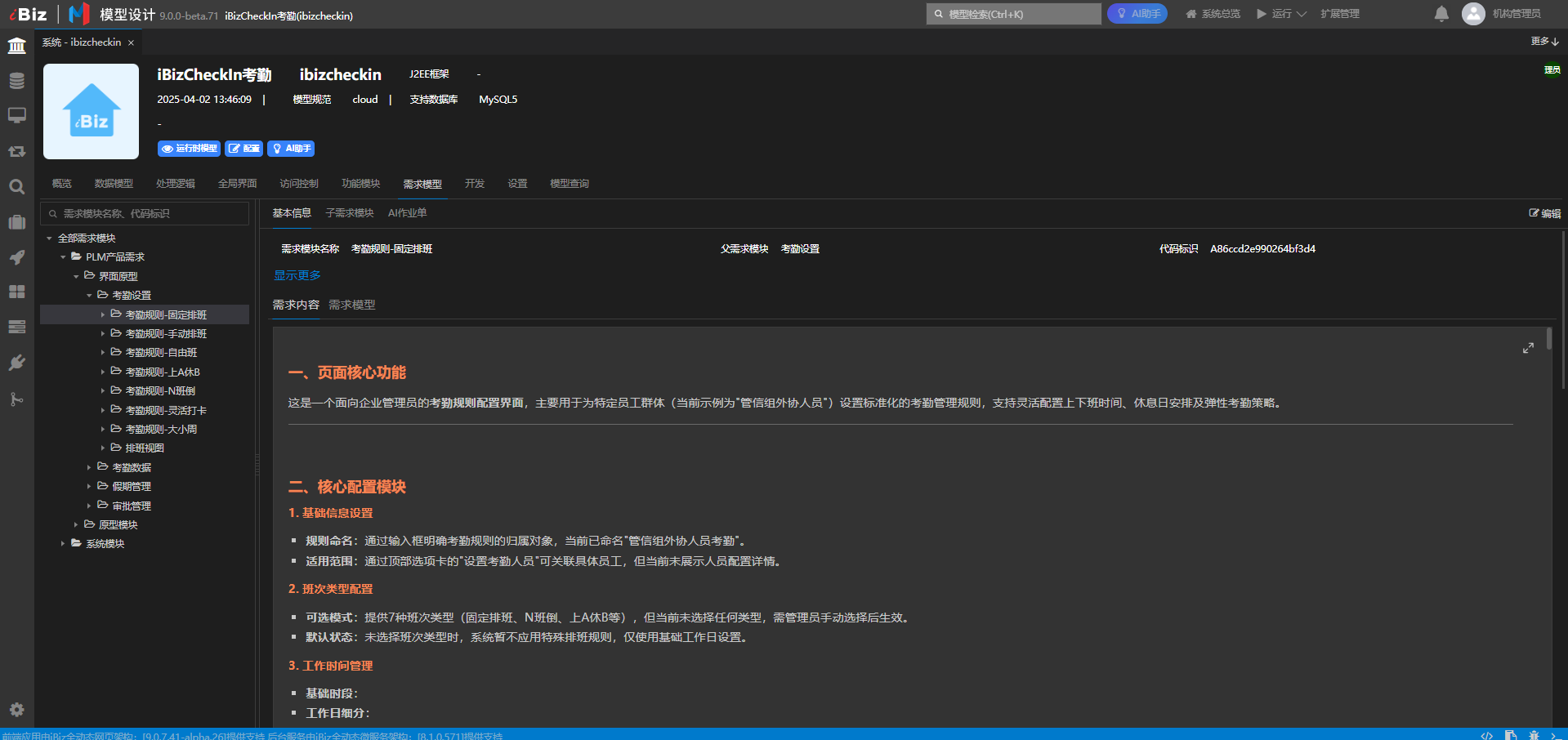 团队首先对得力e+、Odoo出勤等市面上主流且成熟的解决方案进行了本质的业务流程与功能逻辑分析。我们深入研究了其在处理复杂排班、考勤计算、异常处理和报表统计等方面的核心逻辑与交互设计,在iBizModeling平台的需求设计模块,根据功能模块及其层级关系,建立系统的需求树。