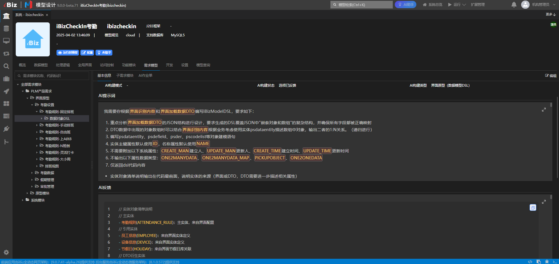 基于前期整理的结构化需求与业务数据,调用iBizModeling平台的AI助手,生成包含业务实体、属性、代码表及关联关系的模块级模型DSL。