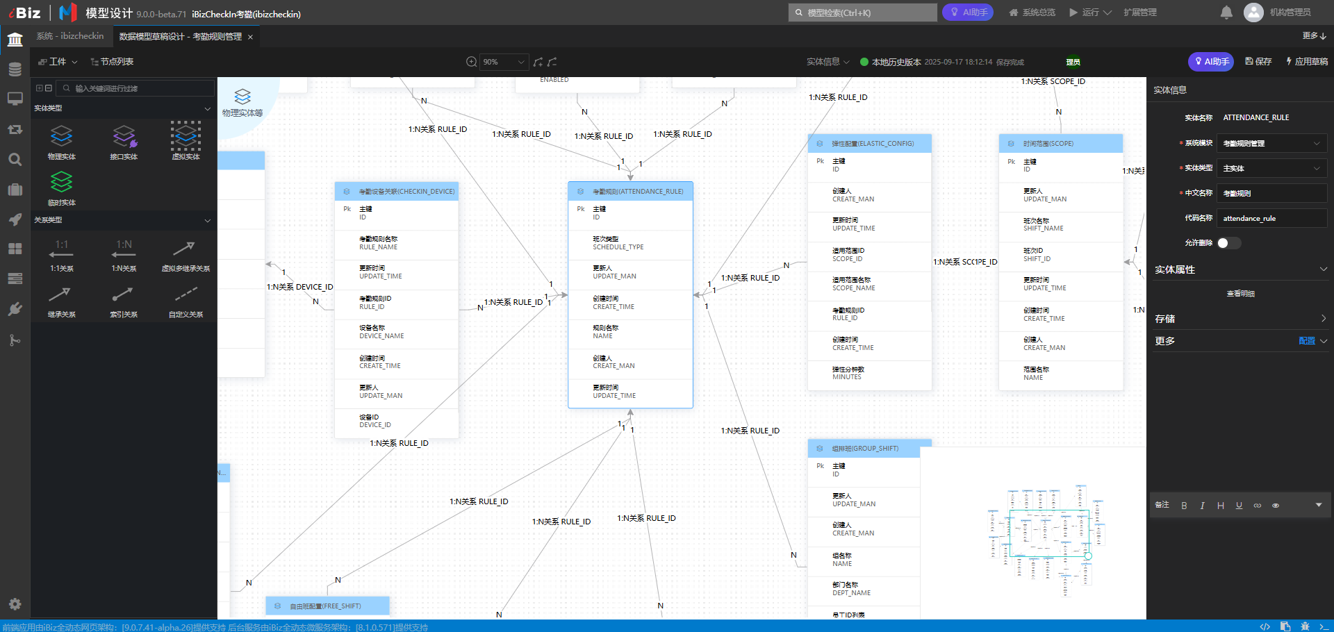 | 需求分析与模型草稿生成(M1) | 项目启动后,团队快速完成对得力e+考勤系统的业务解构。利用iBizModeling平台的AI辅助能力,在一周内完成了全域需求树的搭建与评审,并通过对关键业务数据的分析,由平台AI助手生成了系统首个版本的实体关系建模草稿(ER图),确立了系统的核心数据架构。 |