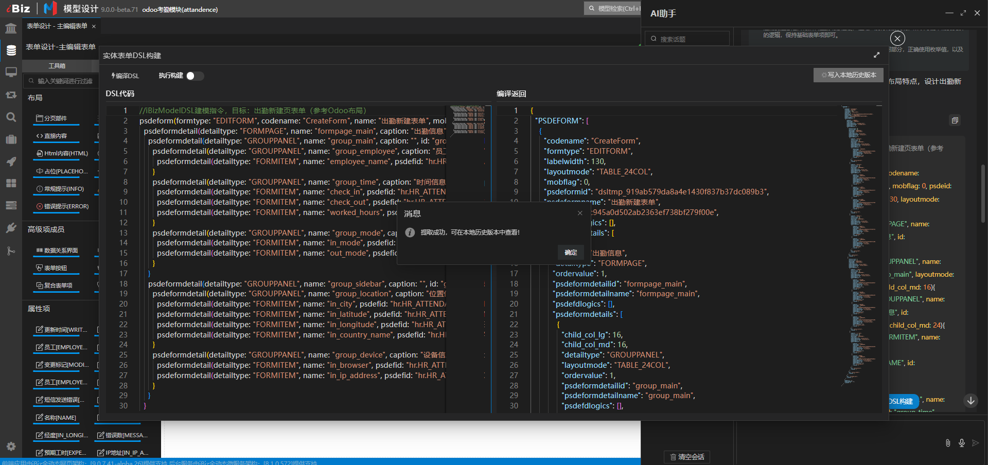 - AI辅助界面DSL生成:在基础界面之上,团队借助平台AI助手,进一步对页面细化。通过智能分析开发人员提出的业务场景描述,并结合已有的数据模型DSL,AI助手能够按照平台规范自动生成符合业务需求的表单DSL。我们只需直接构建AI助手反馈的DSL,即可快速生成页面,显著提升了界面设计的效率与一致性,实现了从数据模型到功能界面的高效、智能化转换。