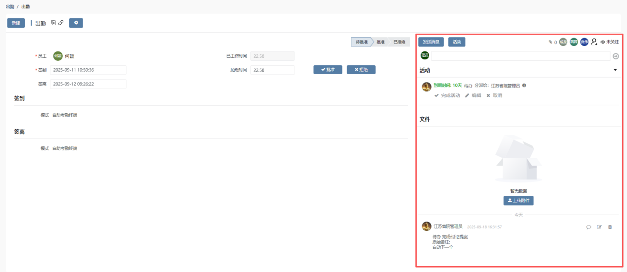 - 社交化协作能力注入:基于平台的“虚拟Mixin”的模型智能组装能力,团队通过继承iBizOdoo提供的 mail.thread等抽象Mixin模型,考勤业务实体自动获得了消息发送、活动流记录、关注者管理、管理附件等通用的社交化协作功能,极大地提升了业务的协同性与互动性。