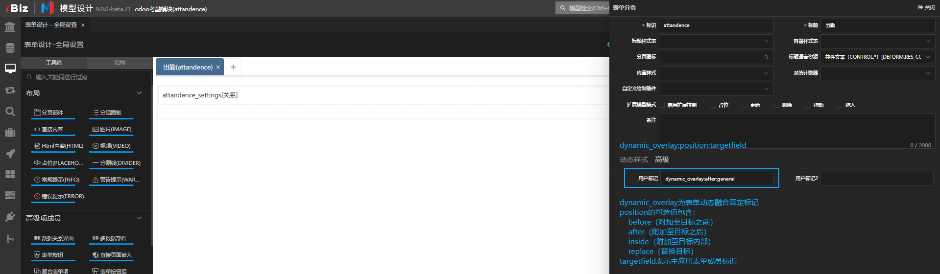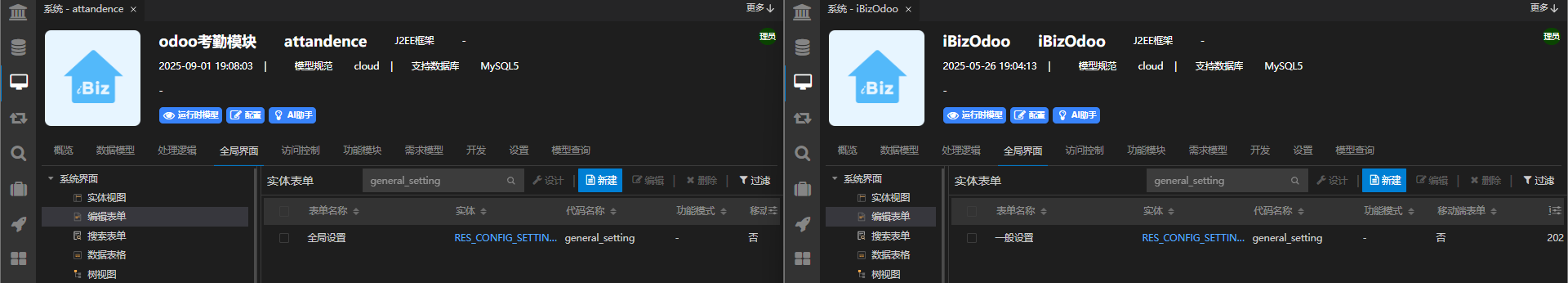 - 跨应用表单融合:基于建模平台完善的跨应用协同架构,团队利用了其表单融合的特性,在模块插件(iBizAttendance)与应用基座(iBizOdoo)中建立同标识表单并设置用户标志,将插件系统中的表单无缝接入基座系统中。