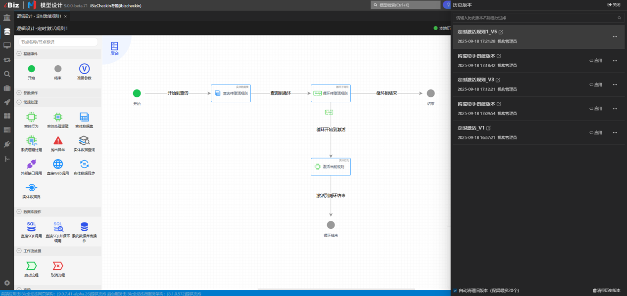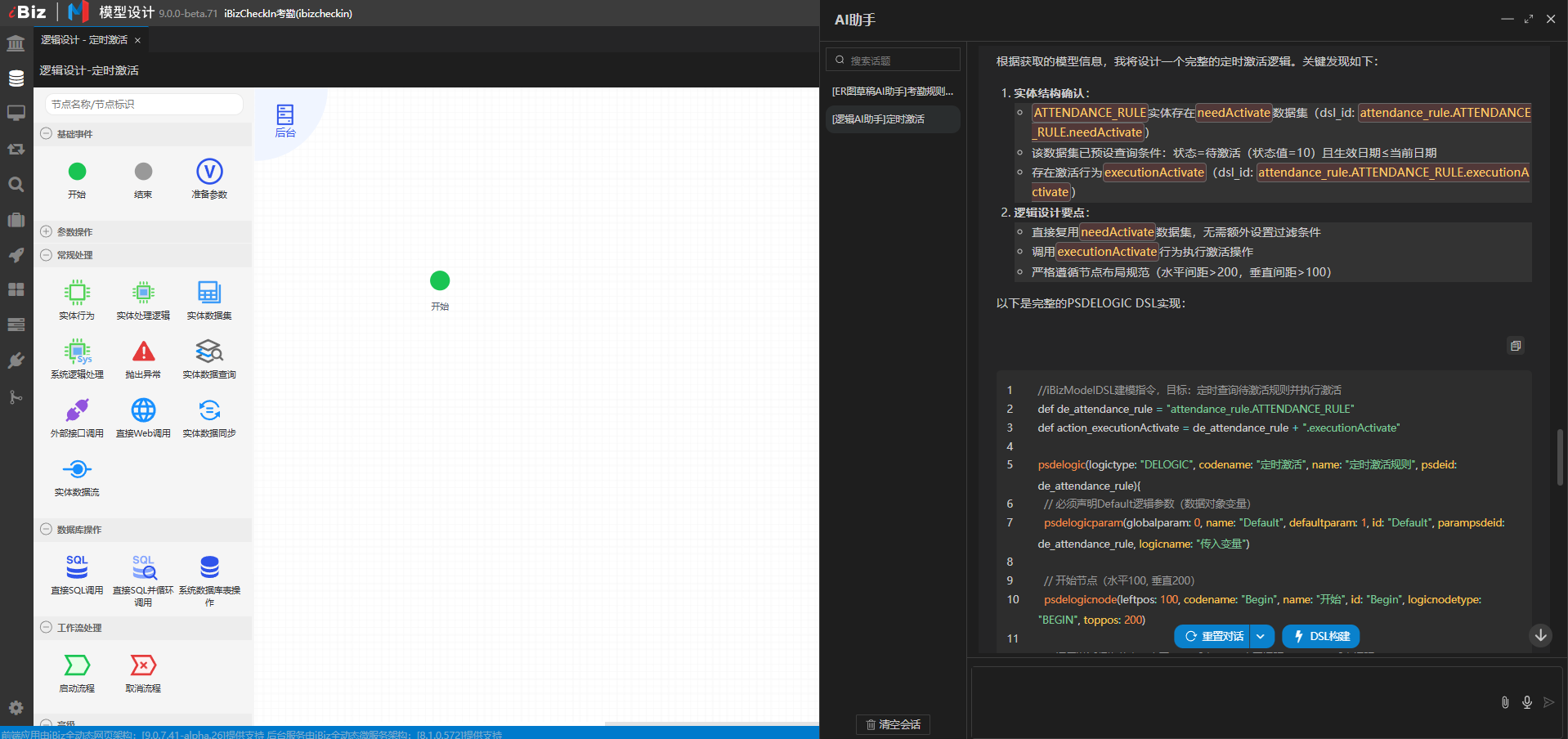 - AI辅助逻辑设计:AI助手在本阶段发挥了核心作用,团队利用平台AI助手进行逻辑设计辅助,使得复杂的业务实现变得简单高效。具体操作时,只需输入业务需求描述(如“定时查询待激活规则进行激活”),AI助手便能够智能解析该描述,结合当前模块的上下文与逻辑DSL,生成符合语义的可嵌入业务逻辑DSL建议。团队可将AI生成的逻辑DSL写入设计器,并借助平台提供的版本管理功能,保存至逻辑历史版本中,便于进行多版本差异对比、回溯和优化迭代。基于这一机制,团队快速提升了复杂业务逻辑的设计和验证效率。